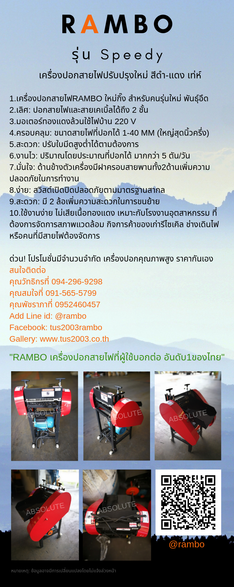 RAMBO Speedy เหมาะสำหรับการเริ่มต้นธุรกิจปอกสายไฟได้ดี ราคาสบายกระเป๋า ใช้งานทนทาน หมดห่วงเรื่องปัญหาจุกจิก เครื่องปอกสายไฟ RAMBO ทุกเครื่องผ่านการ QC ก่อนส่งมอบให้ลูกค้า จึงมั่นใจได้ว่าท่านได้รับสิ่งที่ดีที่สุดจากเราแน่นอน